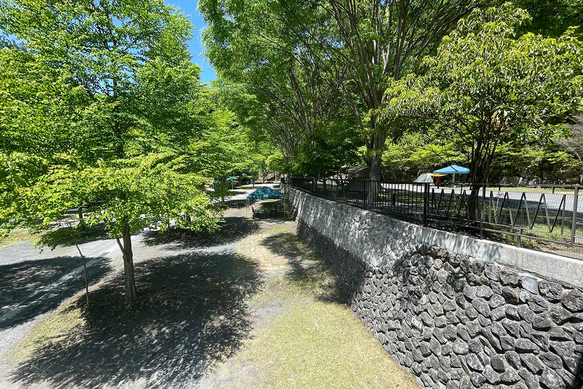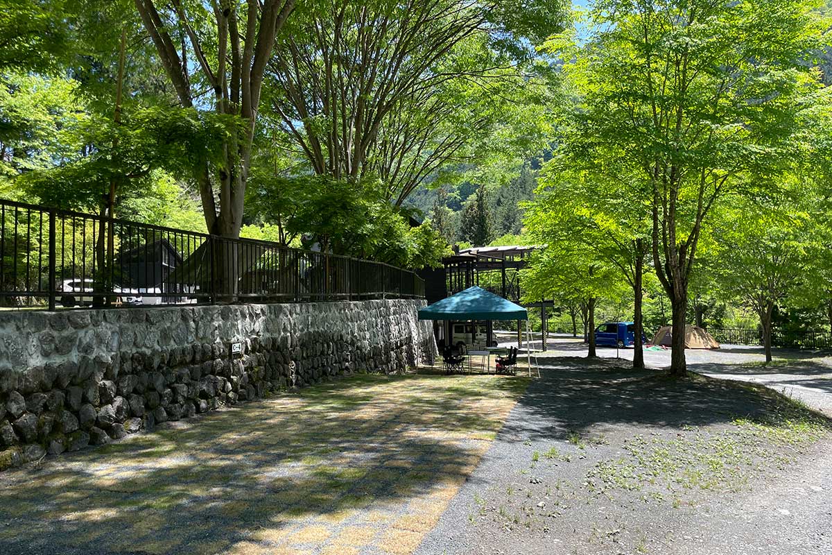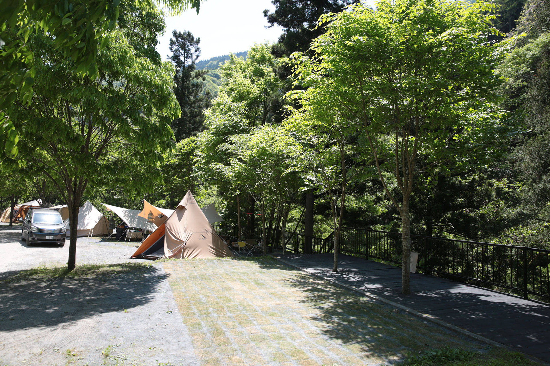 木立を残したサイト、木陰ががあり、夏場は過ごしやすい。テント部分は芝生、バーベキュースペースは砂地になっています。