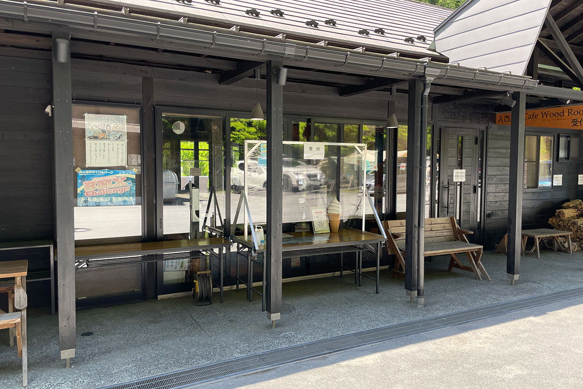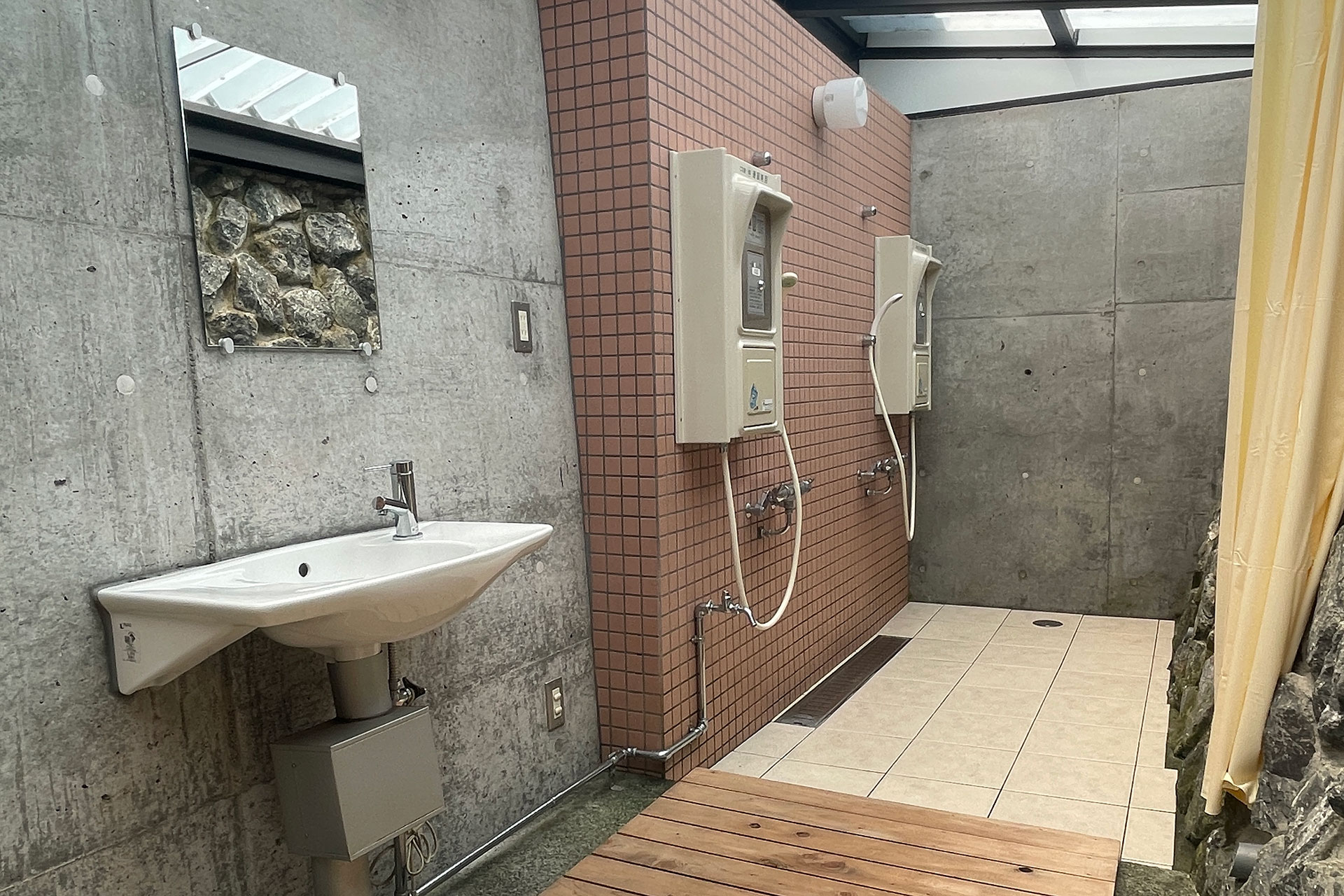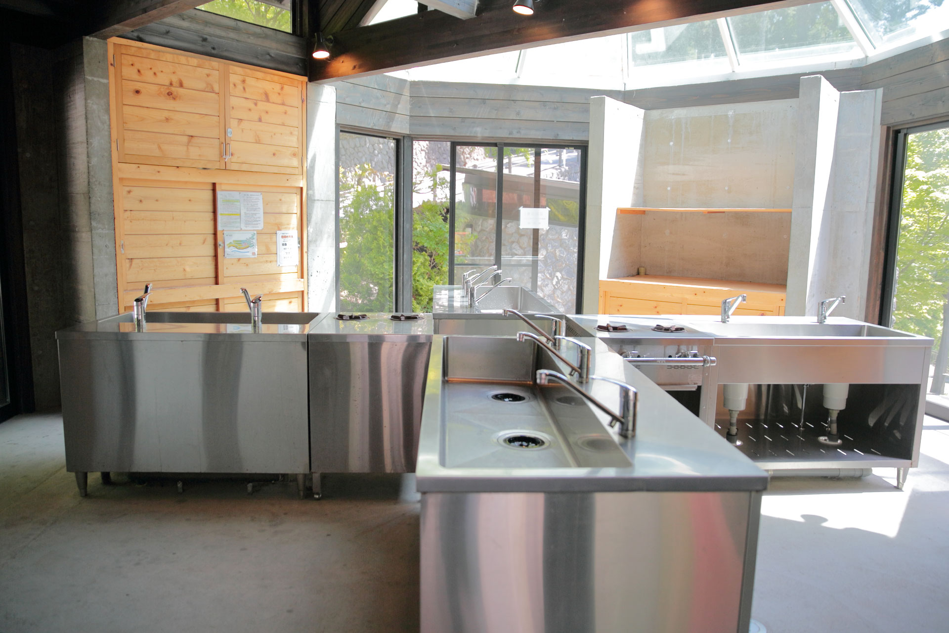 管理棟には受付、売店があり、屋根付テラスがあります。炊事棟とパウダールームが併設されています。